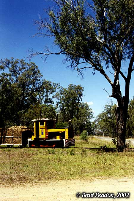 Image: Bingera Mill's Invicta with a rake of empty bins at Wallaville out-depot. 30 July 2002. Lynn Zelmer, photographer