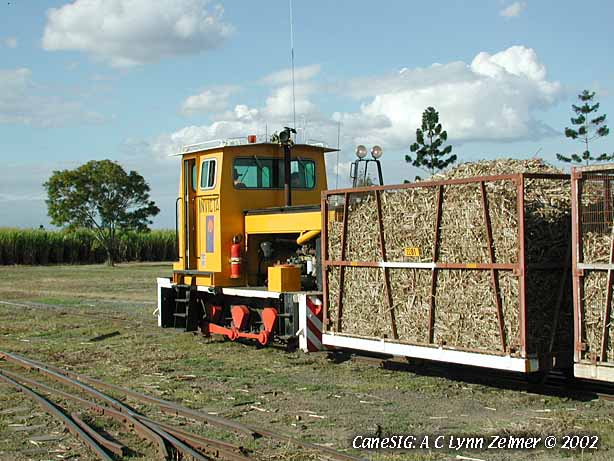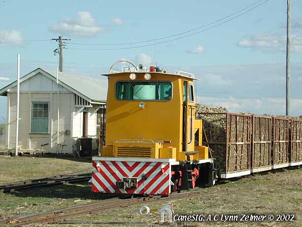 Image: Bingera Mill's Invicta with a rake of full bins at Wallaville out-depot. 30 July 2002. Lynn Zelmer, photographer