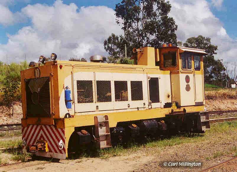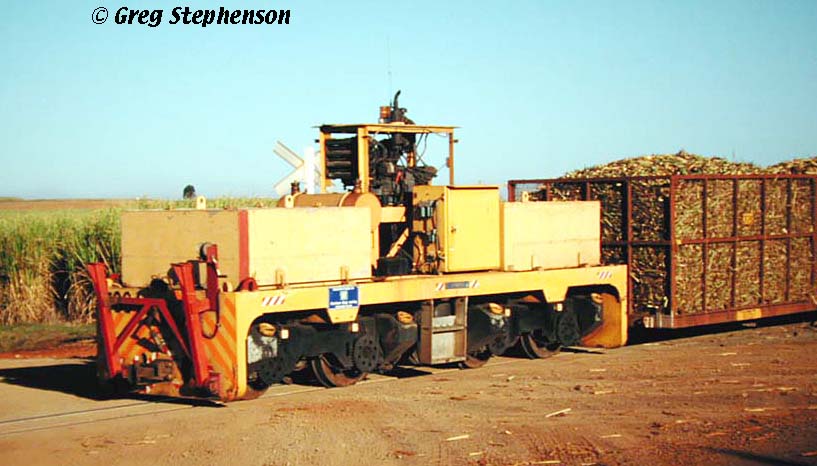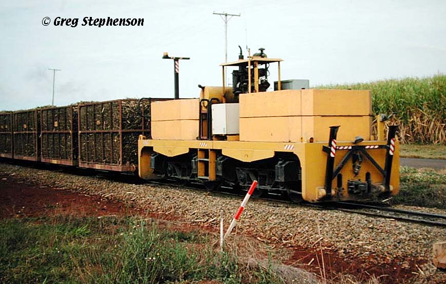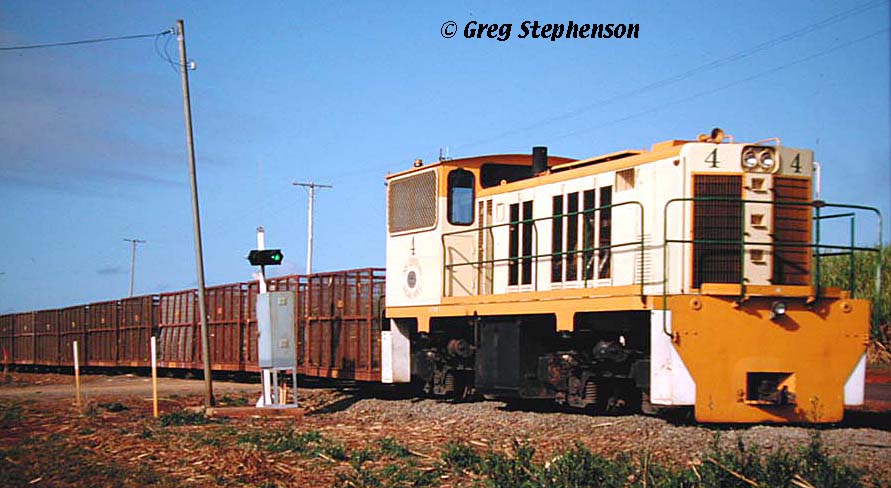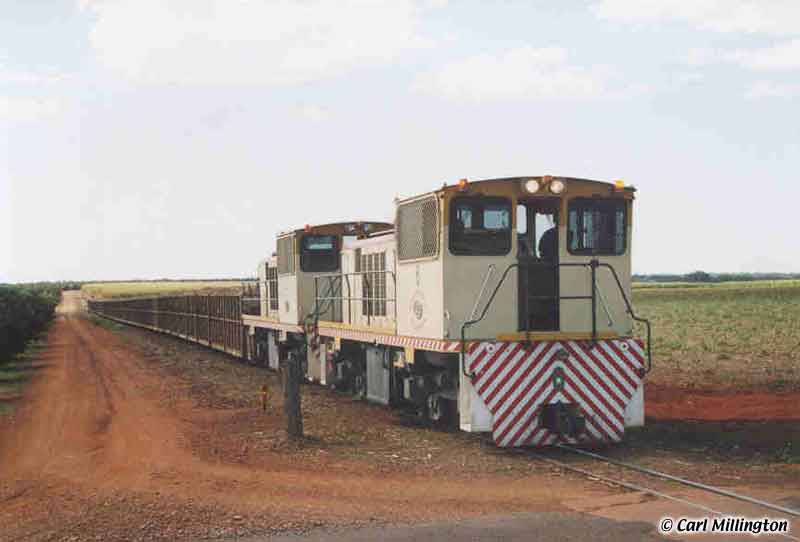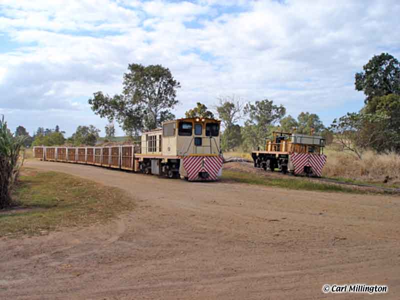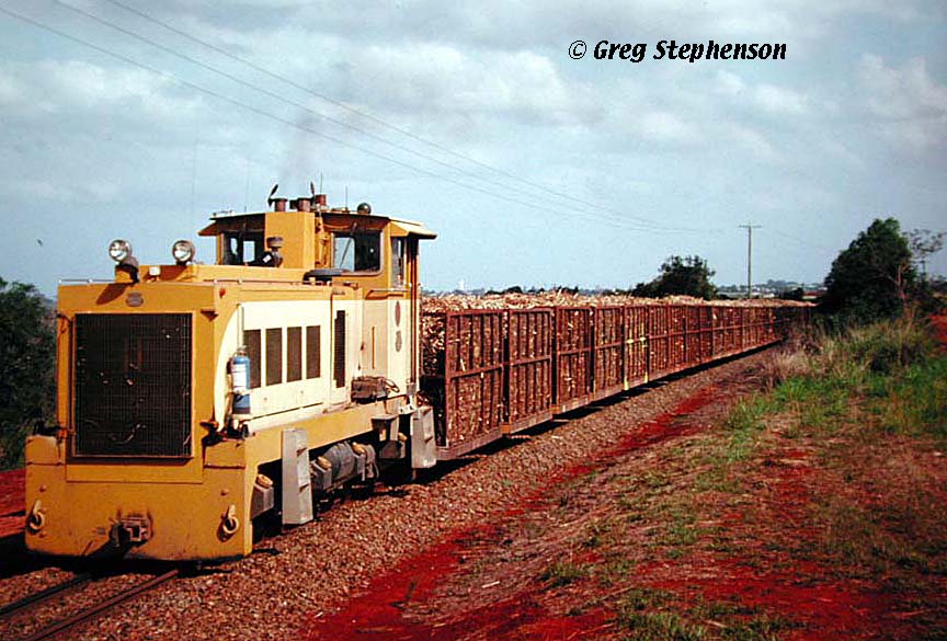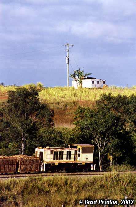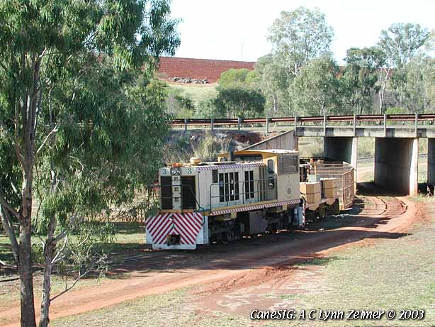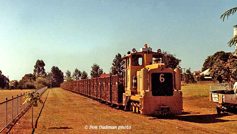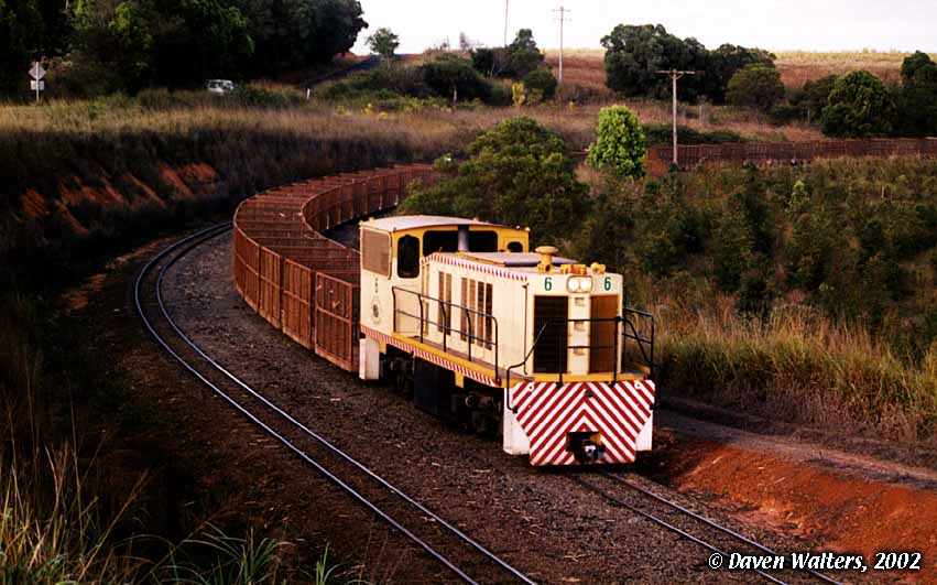 Image: Isis Central Mill; No 6 (ex CCO4) departing Isis Mill on the double track under the Cordelba Rd. Bridge; Daven Walters, photographer, 25.09.02