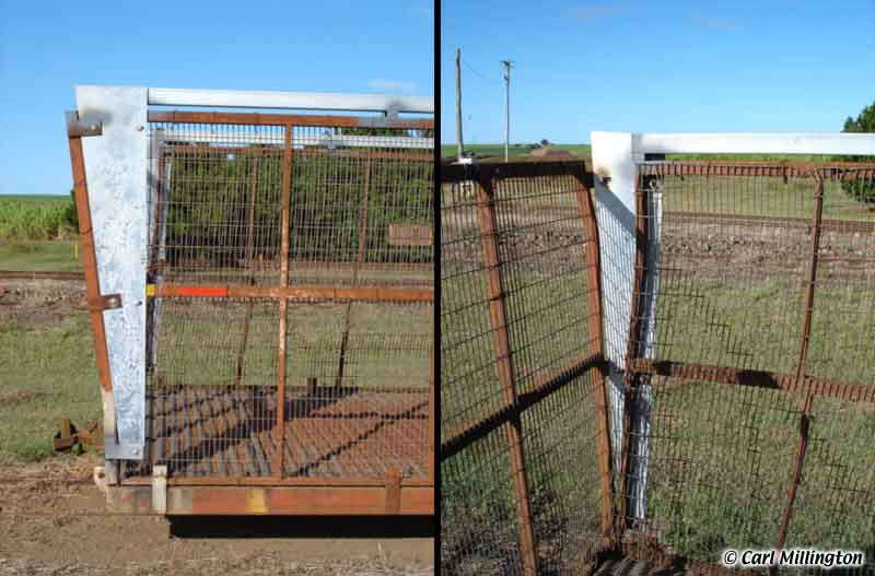 Image: Isis Mill truck dumps, the rollbacks as used at the other 78 new Isis (truck only) truck dumps. This one was at 3 Chain Rd near Bundaberg and right next to a Millaquin mill tramway, August 2005. Carl Millington, photographer.