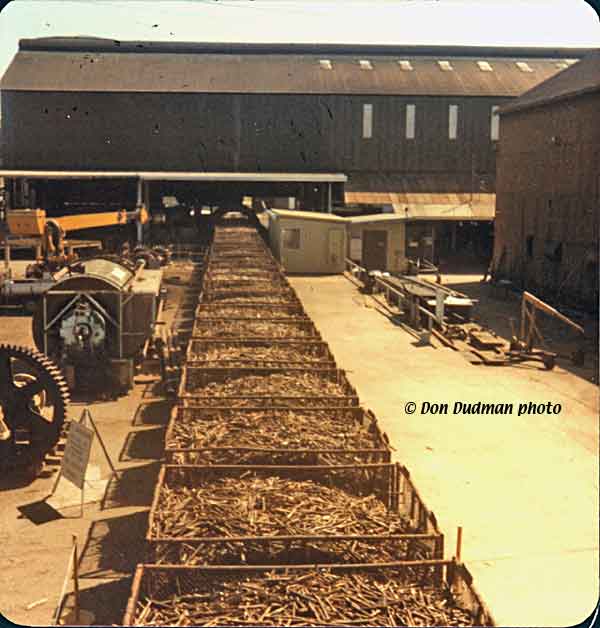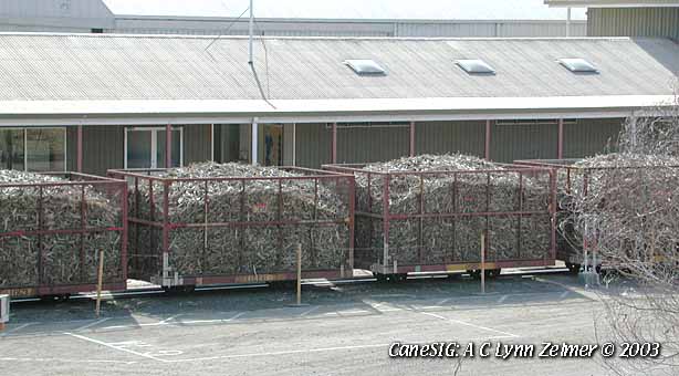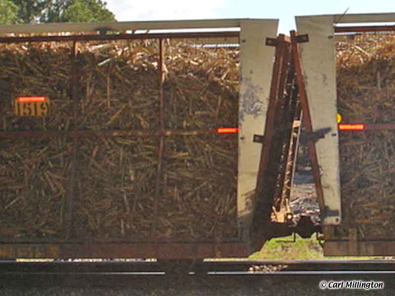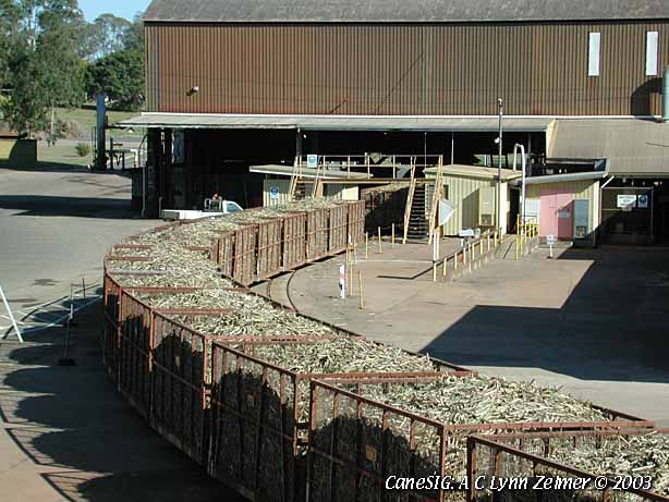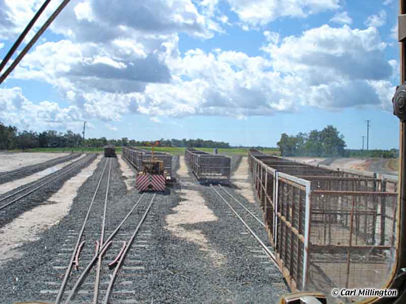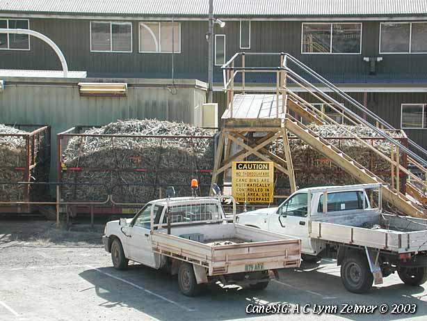 Image: Isis Mill, rake of full bins arriving at weigh scales. 1 August 2002. Lynn Zelmer, photographer