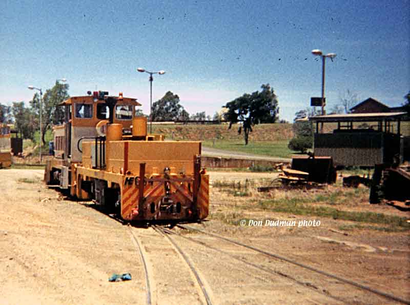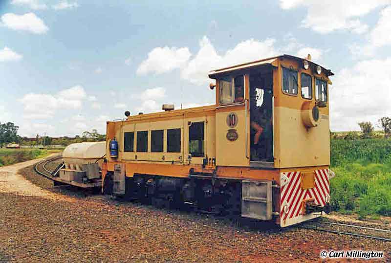 Image: What was probably the last movement of the weed spraying tank at Isis. The tank had been sent away for several cracks to be repaired, which took a month and they still didn't fix the biggest of them all. The photo shows loco D10 about to come off the line from the loco shed and through the full yard, on its way to the sleeper plant where the sprayer is normally stored. You might also note the various locking devices on D10. As it is the allocated navvy engine, it has to be protected against unlawful entry. The stripes on the pilots are not painted on but stuck on. Each stripe is 2 inch's wide and run down the pilot. The white strip across the bottom, which was done with a spray can, is because every other loco's 'sticker stripes' were starting to peel off after been hit by trash. As they are stuck on stripes, we are not allowed to use the water blaster near the pilots when washing down a loco, you must use a brush and bucket, c March 2003. Carl Millington, photographer.