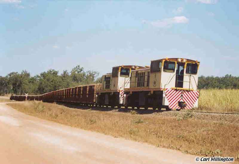 Image: Isis Mill: D2 at the 2 mile on the Goodwood line. D2 failed at Goodwood siding with a buggered transmission. I was the driver at the time and was driven back to the shed while my relief brought D6 out and towed D2 home. The radios where swapped at Goodwood so D6 would control the van. Load was 60 full 6ton bins, 13 September 2003. Carl Millington, photographer.