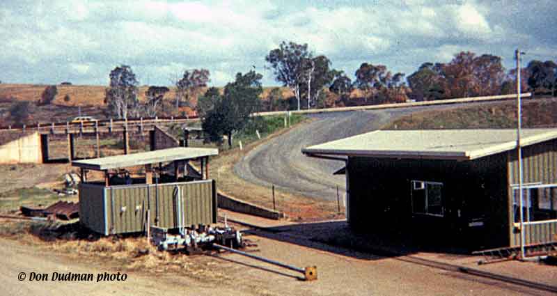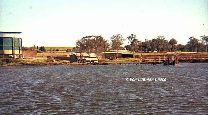 Image: Isis Central Mill: Truck repair shop beyond empty yard, looking across dam; bagasse loft (left) , Don Dudman (Mill Electrician), photographer