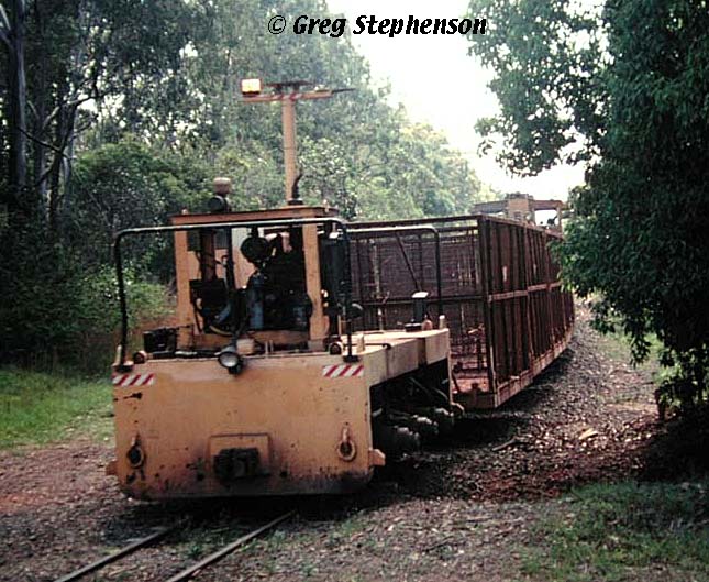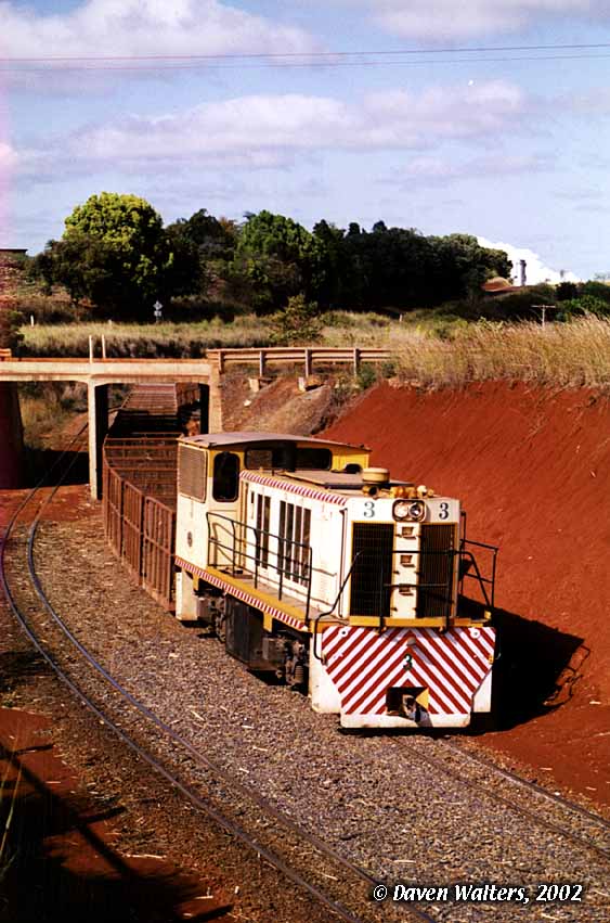 Image: Isis Mill's bogie #3 and brake van arriving at mill with rake of empty bins. 1 August 2002. Lynn Zelmer, photographer