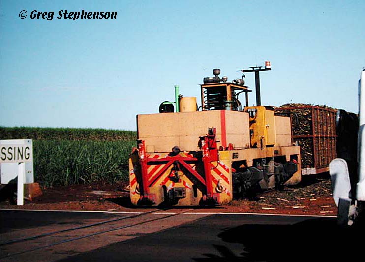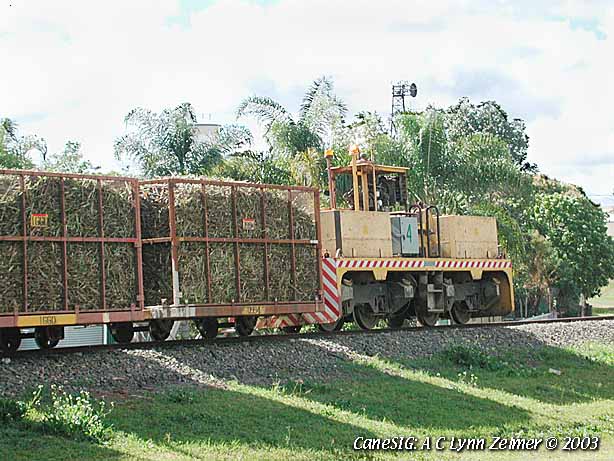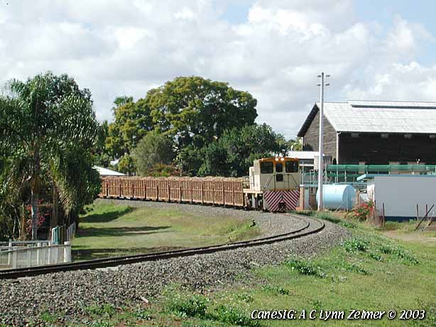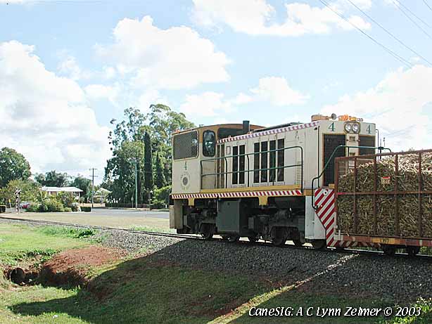 Image: Isis Mill's bogie loco #4 pulling a rake of fulls through Isis town. 1 August 2002. Lynn Zelmer, photographer