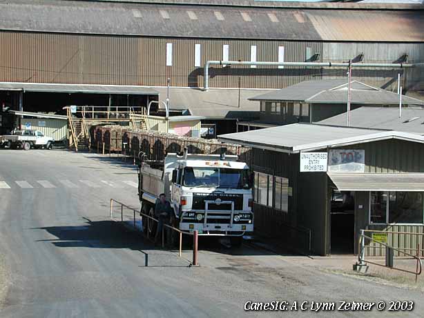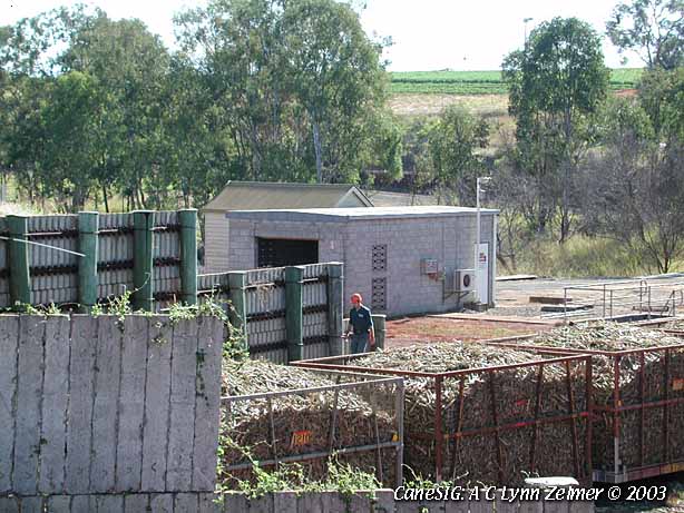 Image: Isis Mill, long shot of full bins arriving at weigh scale. 1 August 2002. Lynn Zelmer, photographer
