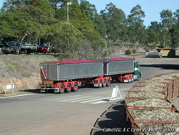 Image: Isis Mill; empty double-length transporter entering mill. 1 August 2002. Lynn Zelmer, photographer