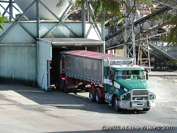 Image: Isis Mill, loaded double length transporter (sugar?) leaving loading silo. 1 August 2002. Lynn Zelmer, photographer