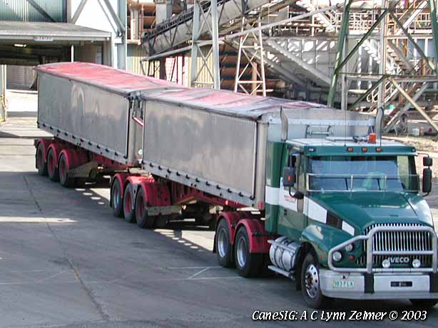 Image: Isis Mill, loaded double length transporter (sugar?) leaving mill. 1 August 2002. Lynn Zelmer, photographer