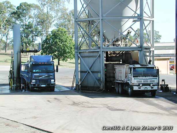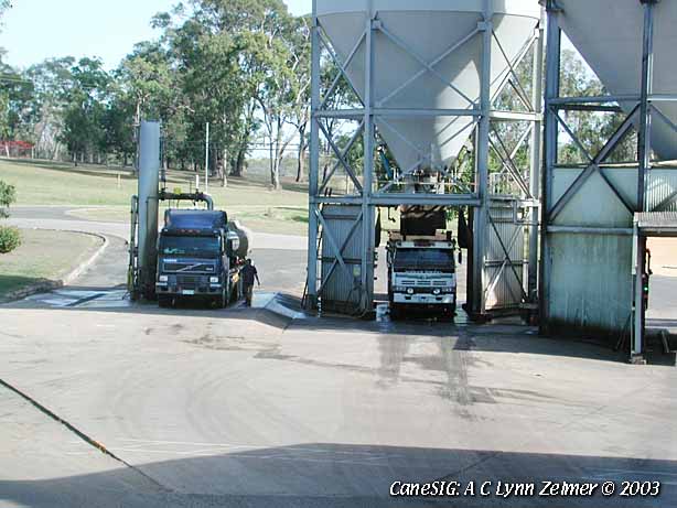 Image: Isis Mill, close-up of trucks loading at overhead silos (likely molasses left and mill mud centre?). 1 August 2002. Lynn Zelmer, photographer