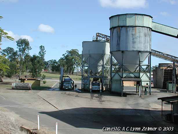 Image: Isis Mill; long shot, trucks loading molasses (left) and mill mud (?). 1 August 2002. Lynn Zelmer, photographer