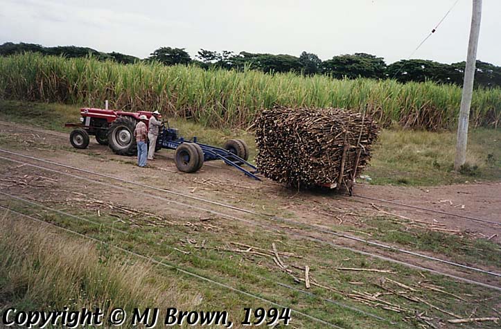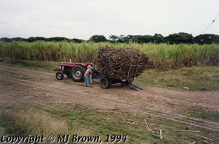 Image: Fiji Oct/Nov 1994: Malcolm J Brown Collection. Tractor and trailer with wholestick cane wagon--unloaded onto track. Malcolm J Brown, photographer