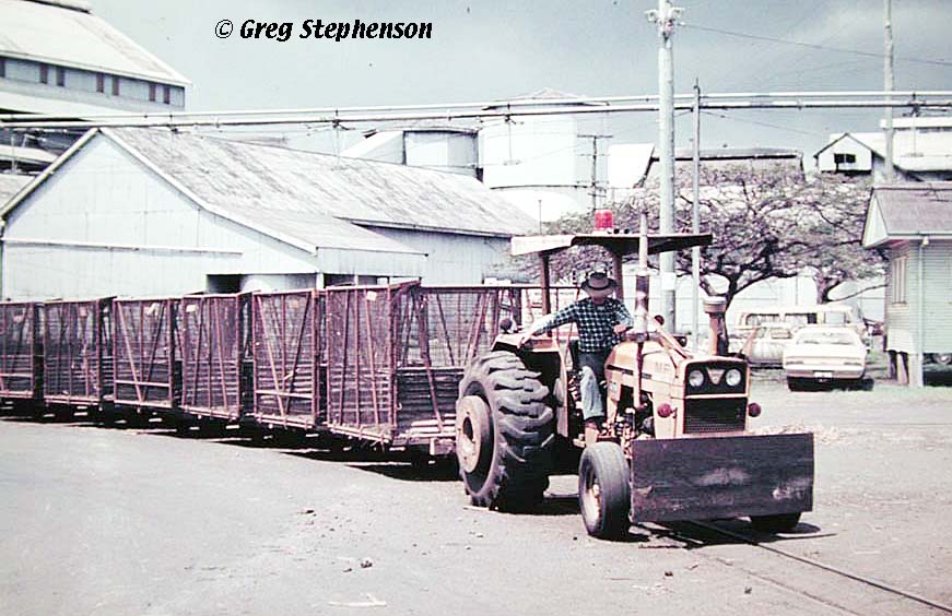 Image: Gregorio Arlee Manalich Mill, Cuba: tractor pulling in-field sugar cane wagons, on a railfan tour, February 2003. Claus Kleinhapl, photographer.