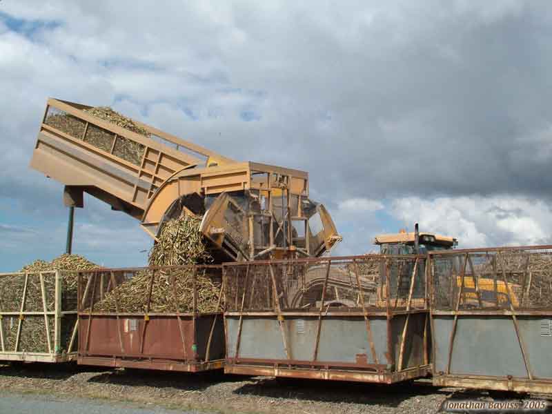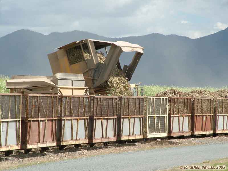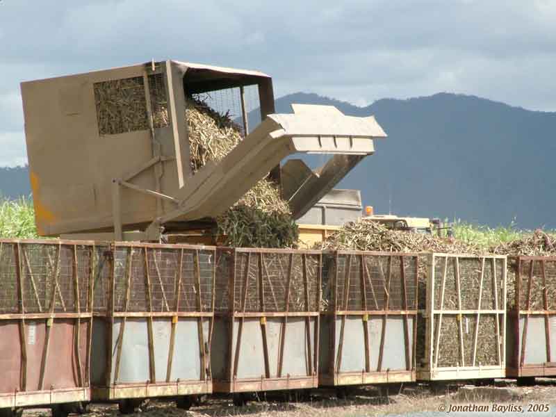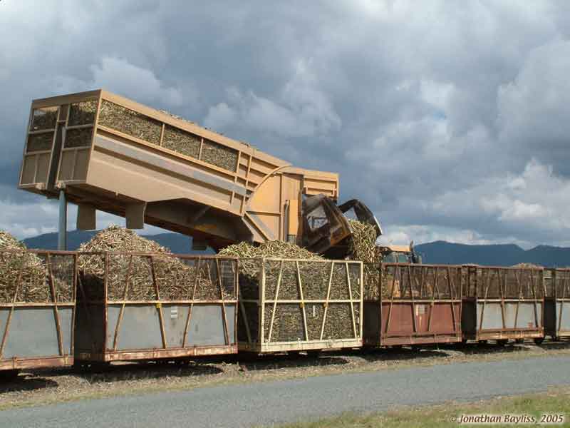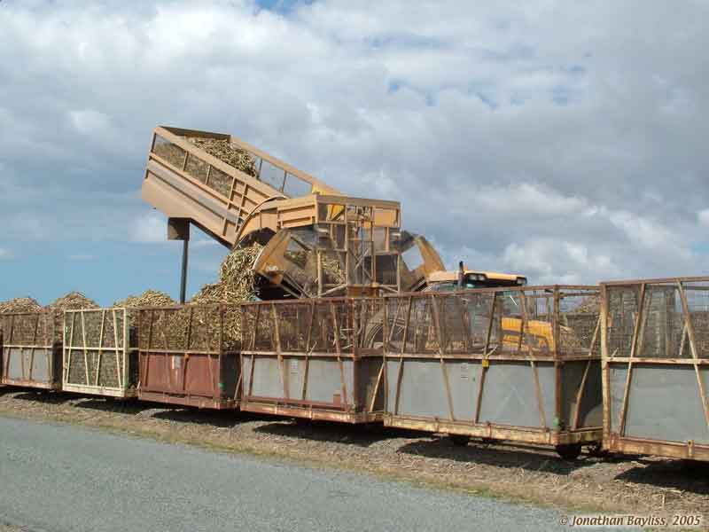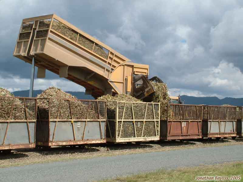 Image: Mackay area: Tractor-pulled end-tipping, side-delivery, in-field transporter unloading at rail transfer point. 4 of 5 views. 22 Aug 2005. Jonathan Bayliss photographer