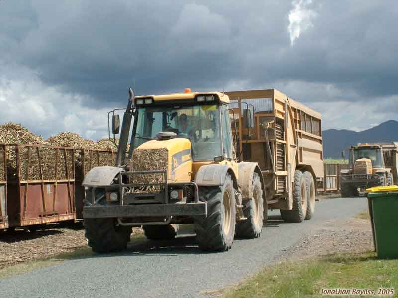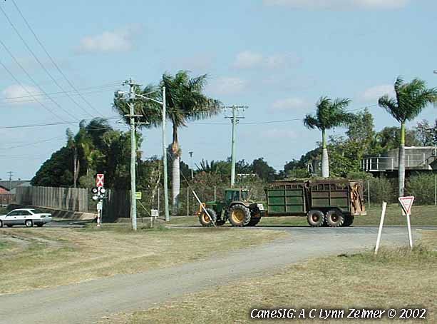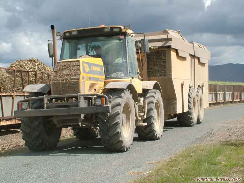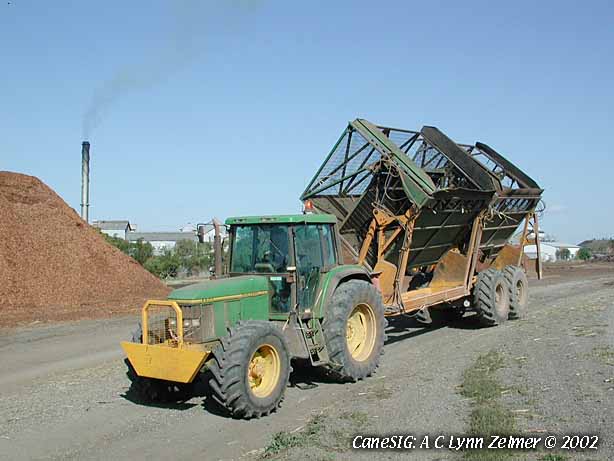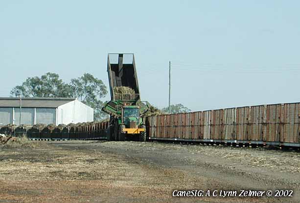 Image: Tractor-hauled long side-dumping in-field cane transporter at Millaquin Mill. 31 August 2002. Lynn Zelmer, photographer