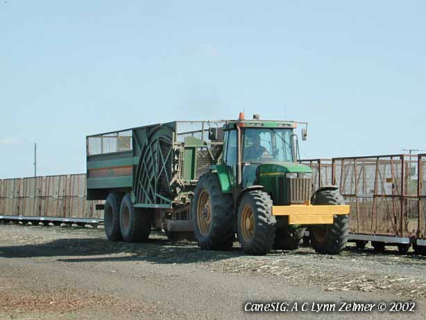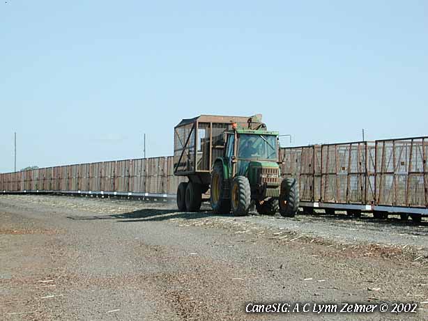 Image: Tractor-hauled long side-dumping in-field cane transporter at Millaquin Mill. 2 of 2. 31 August 2002. Lynn Zelmer, photographer